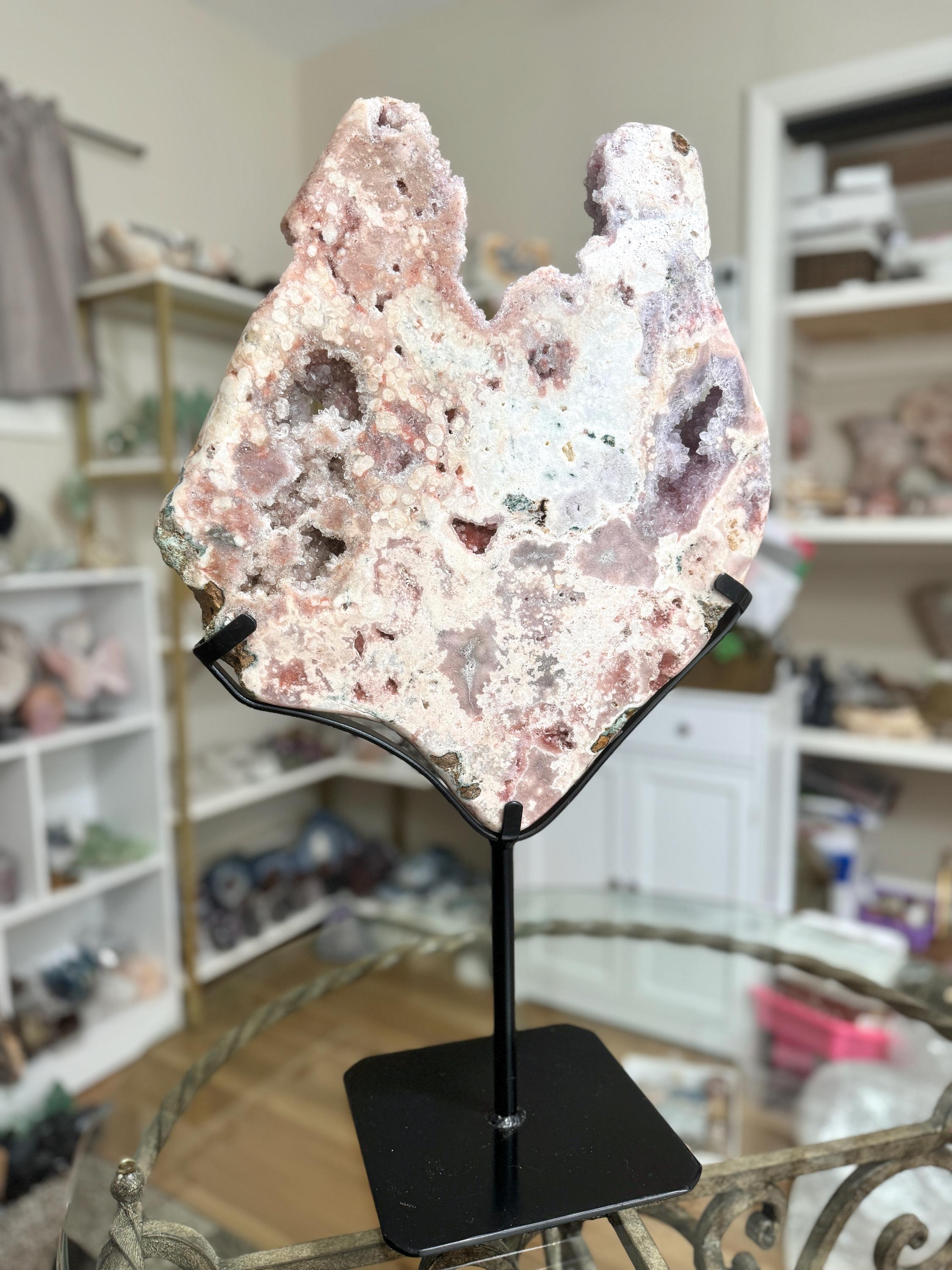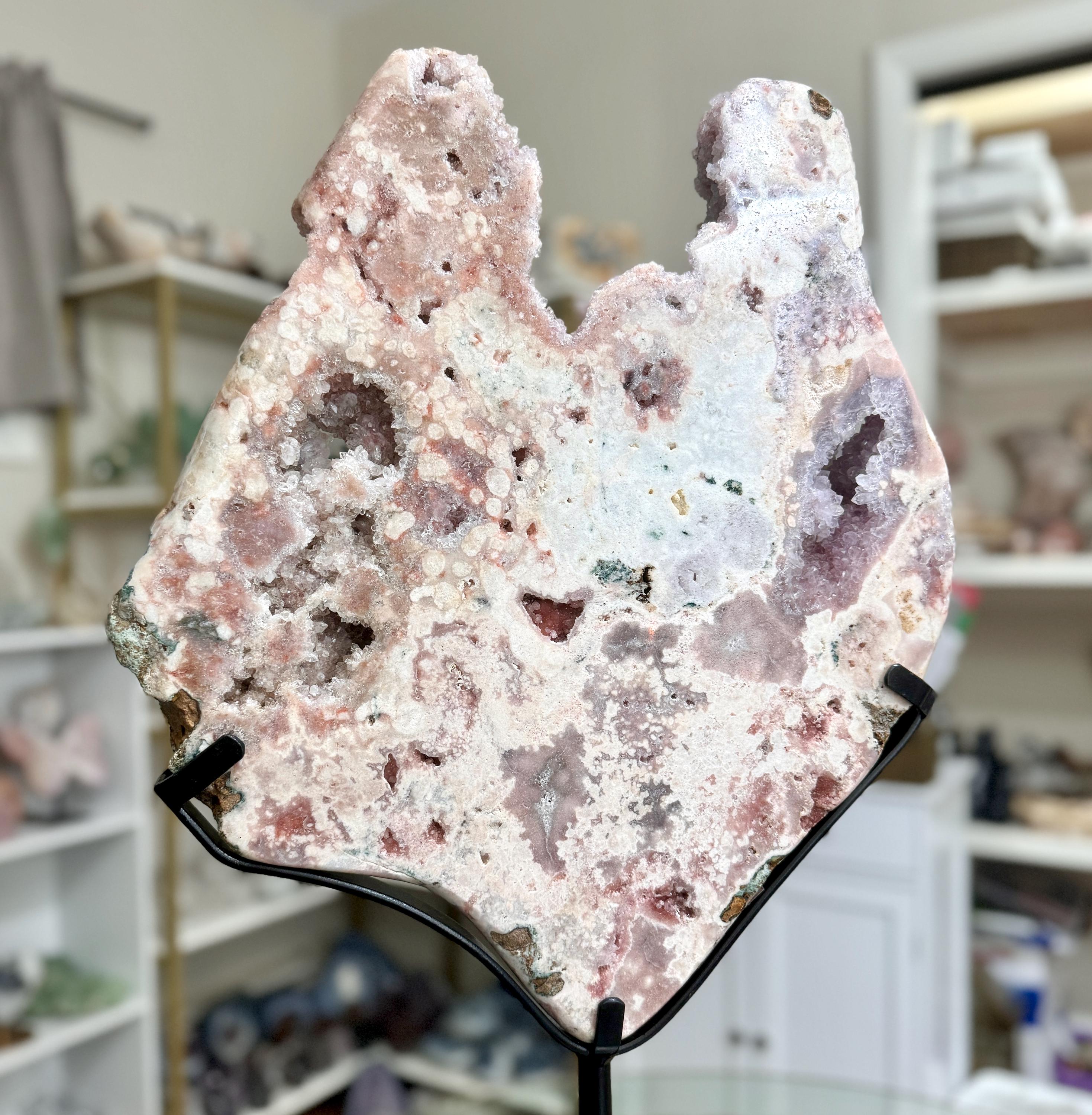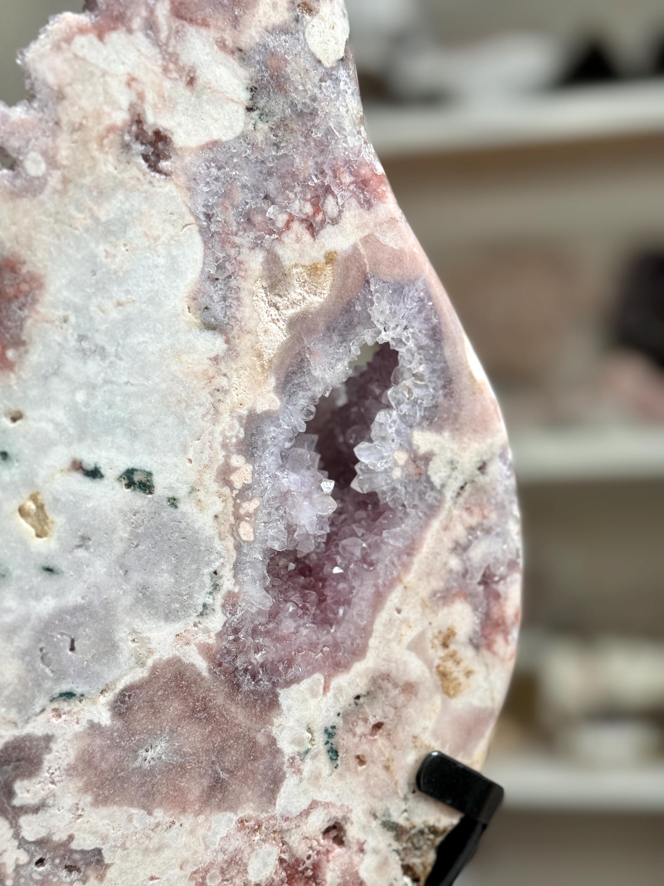 This absolutely jaw-dropping druzy pink amethyst slab is the queen of all statement pieces! The slab herself weighs in at a whopping 21.4 lbs. The pink and lilac druzy caves and pockets makes this piece truly spectacular. This unique slab also contains gorgeous strands of jasper throughout the one side which also contains incredible orbs towards the bottom middle of the piece which just breathtaking!!