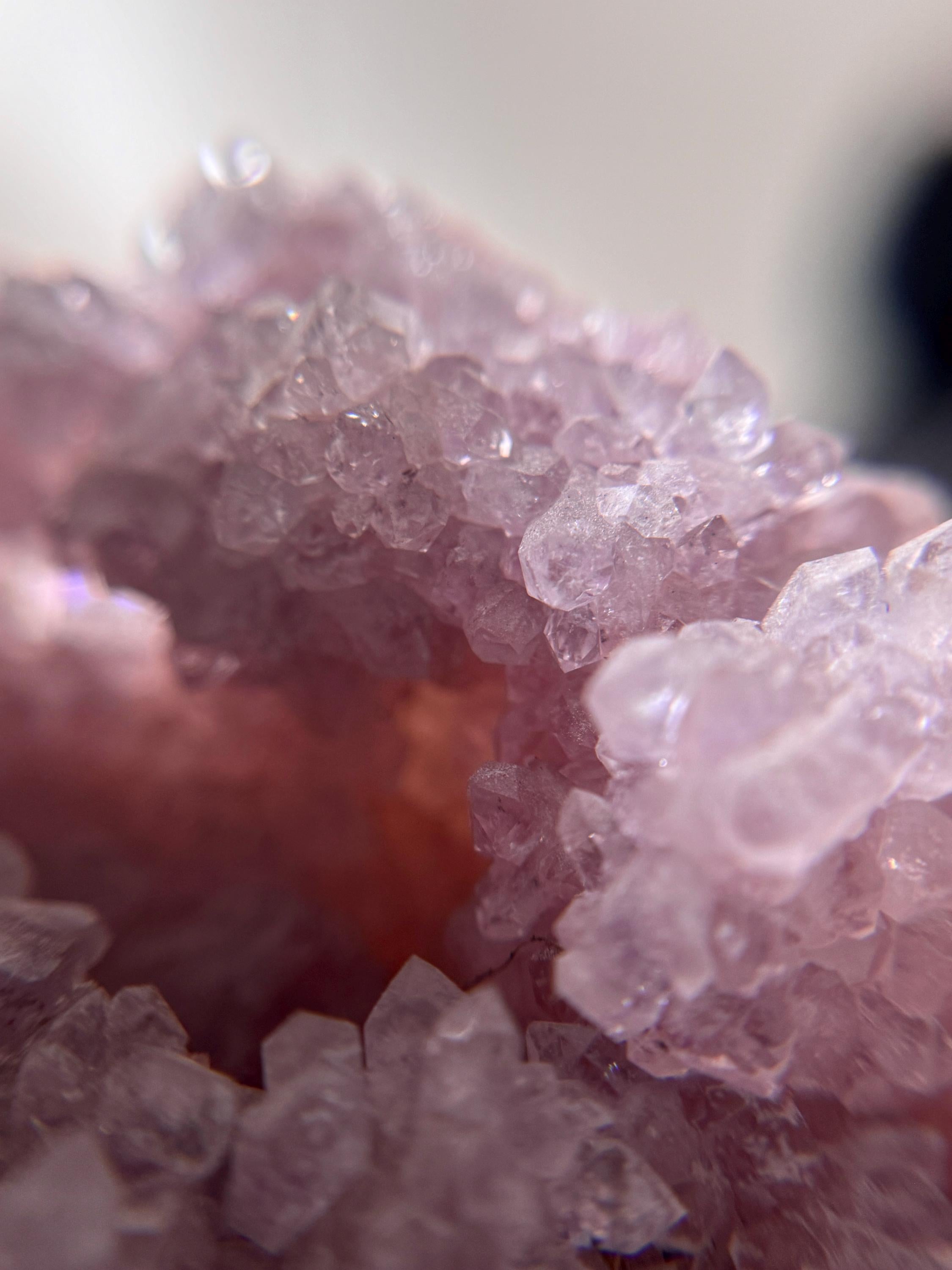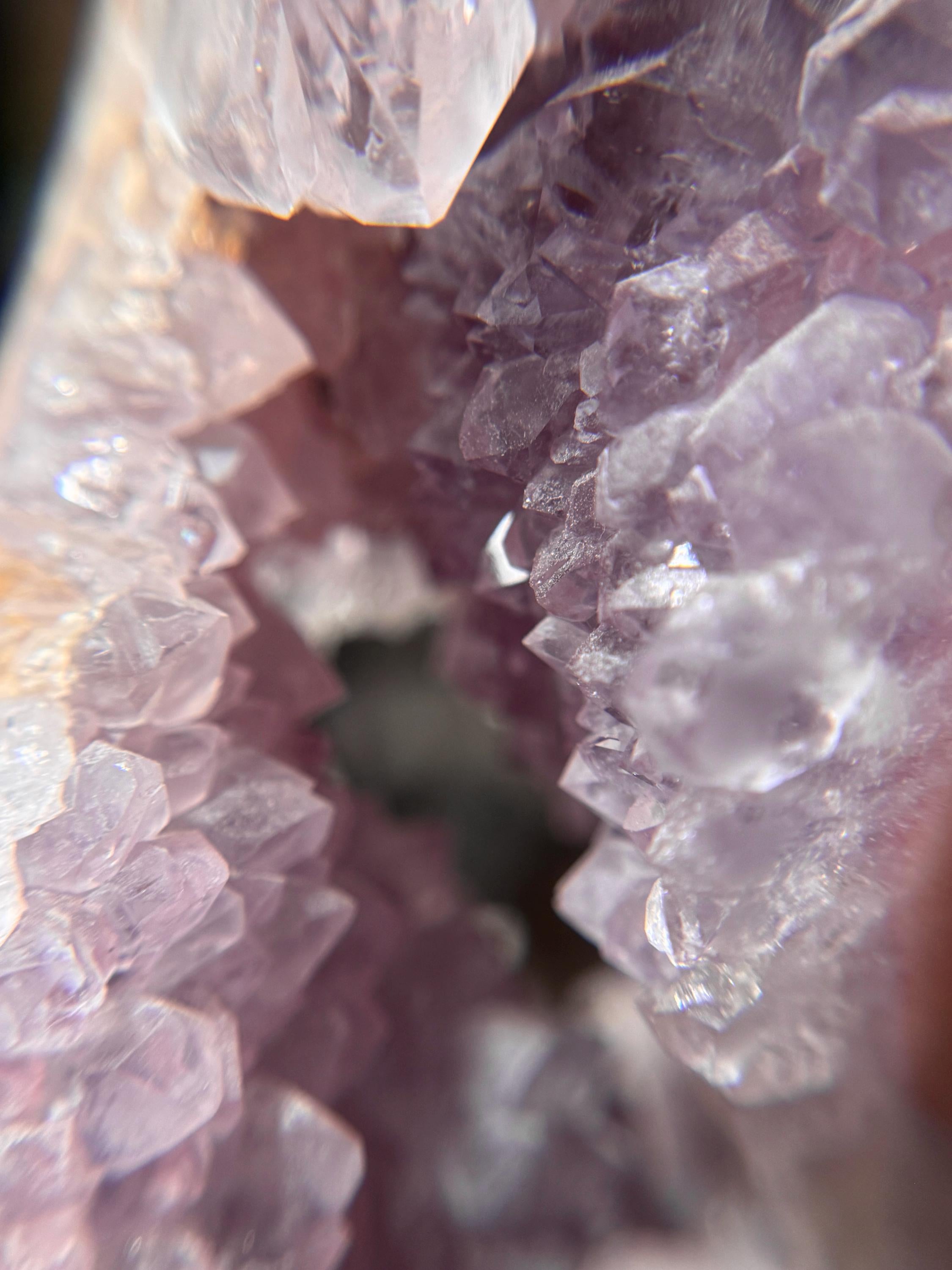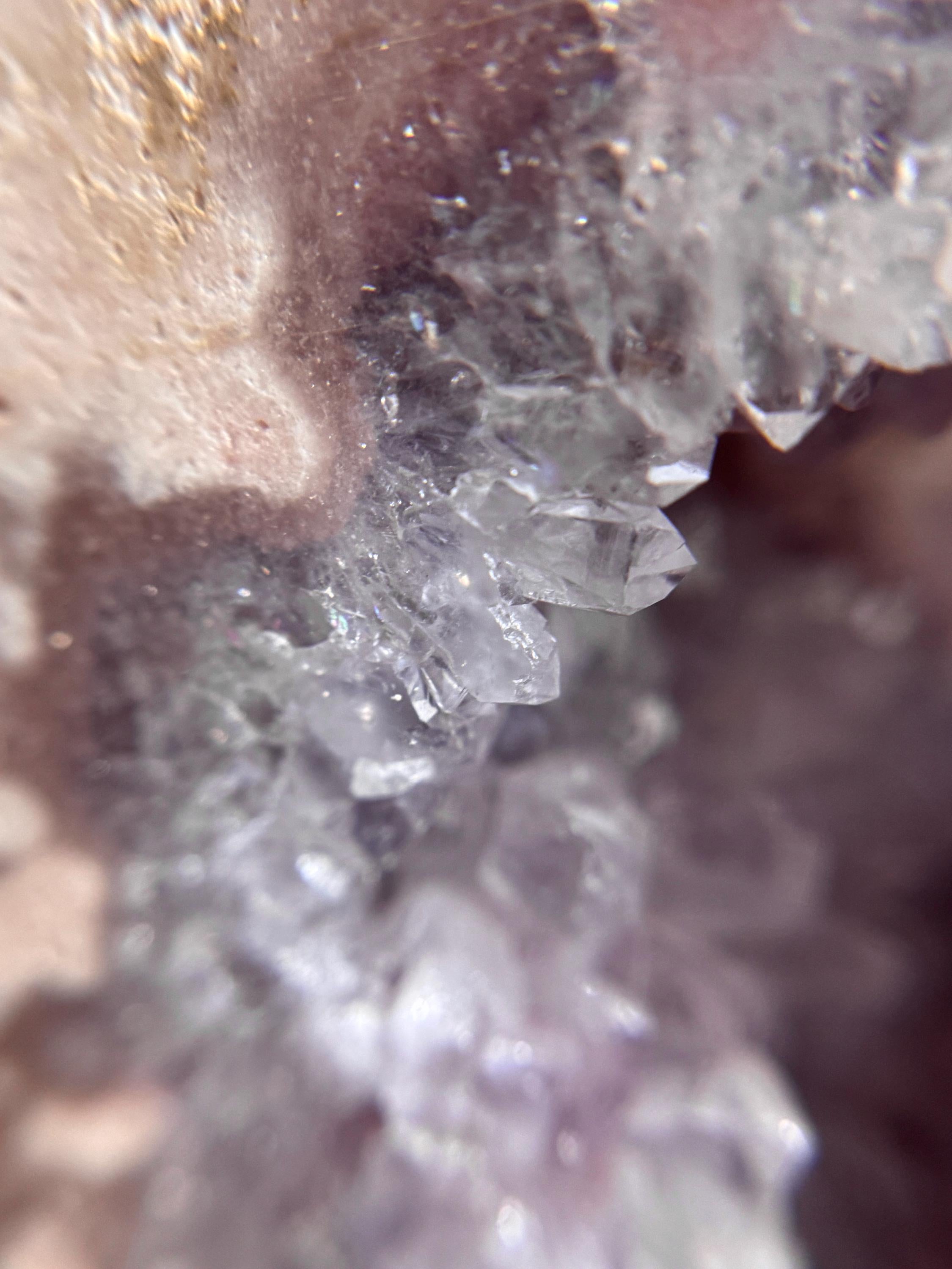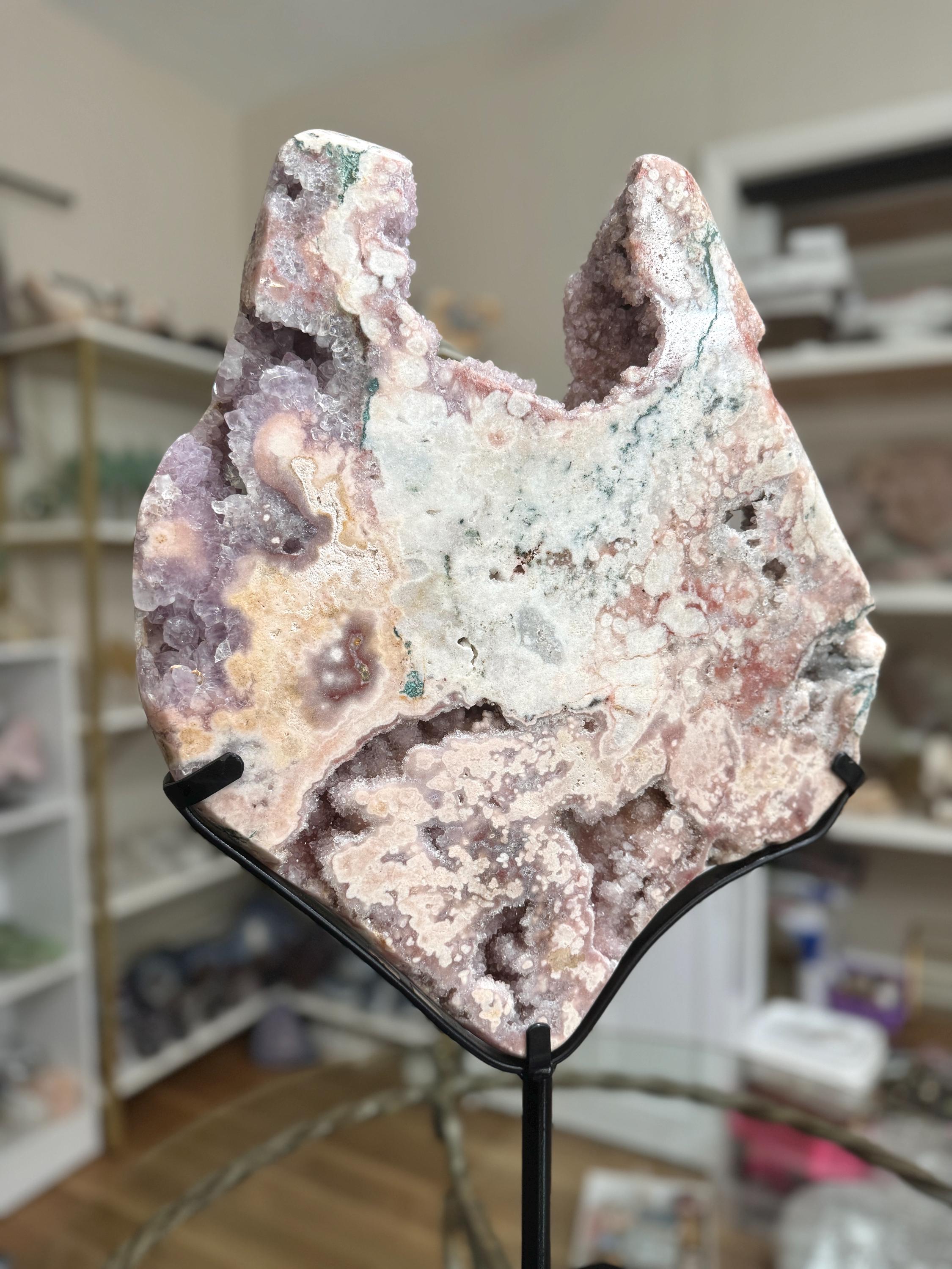 This absolutely jaw-dropping druzy pink amethyst slab is the queen of all statement pieces! The slab herself weighs in at a whopping 21.4 lbs. The pink and lilac druzy caves and pockets makes this piece truly spectacular. This unique slab also contains gorgeous strands of jasper throughout the one side which also contains incredible orbs towards the bottom middle of the piece which just breathtaking!!