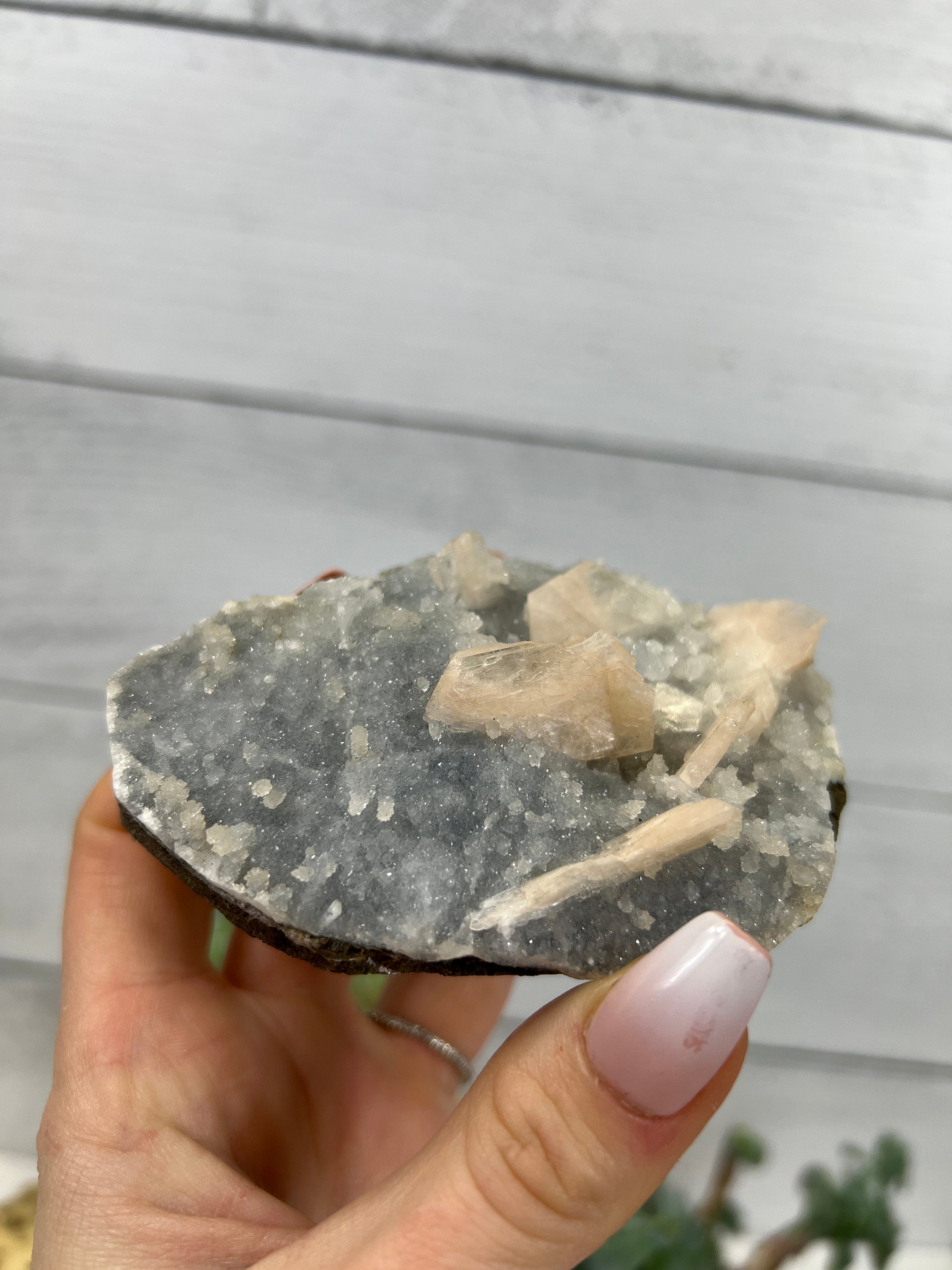 This is a sugary, druzy blue Chalcedony cluster with gorgeous peach stilbite inclusions throughout!