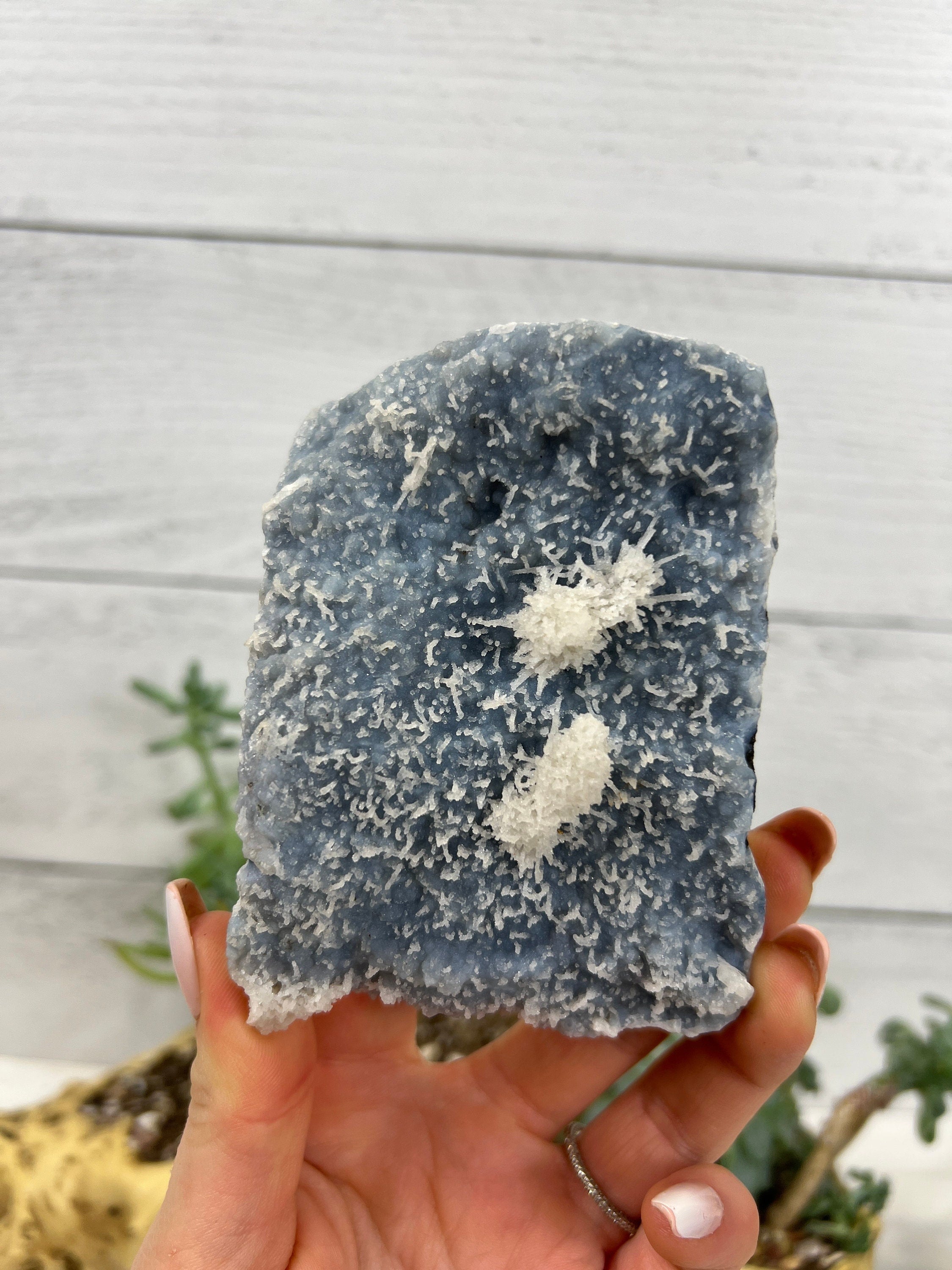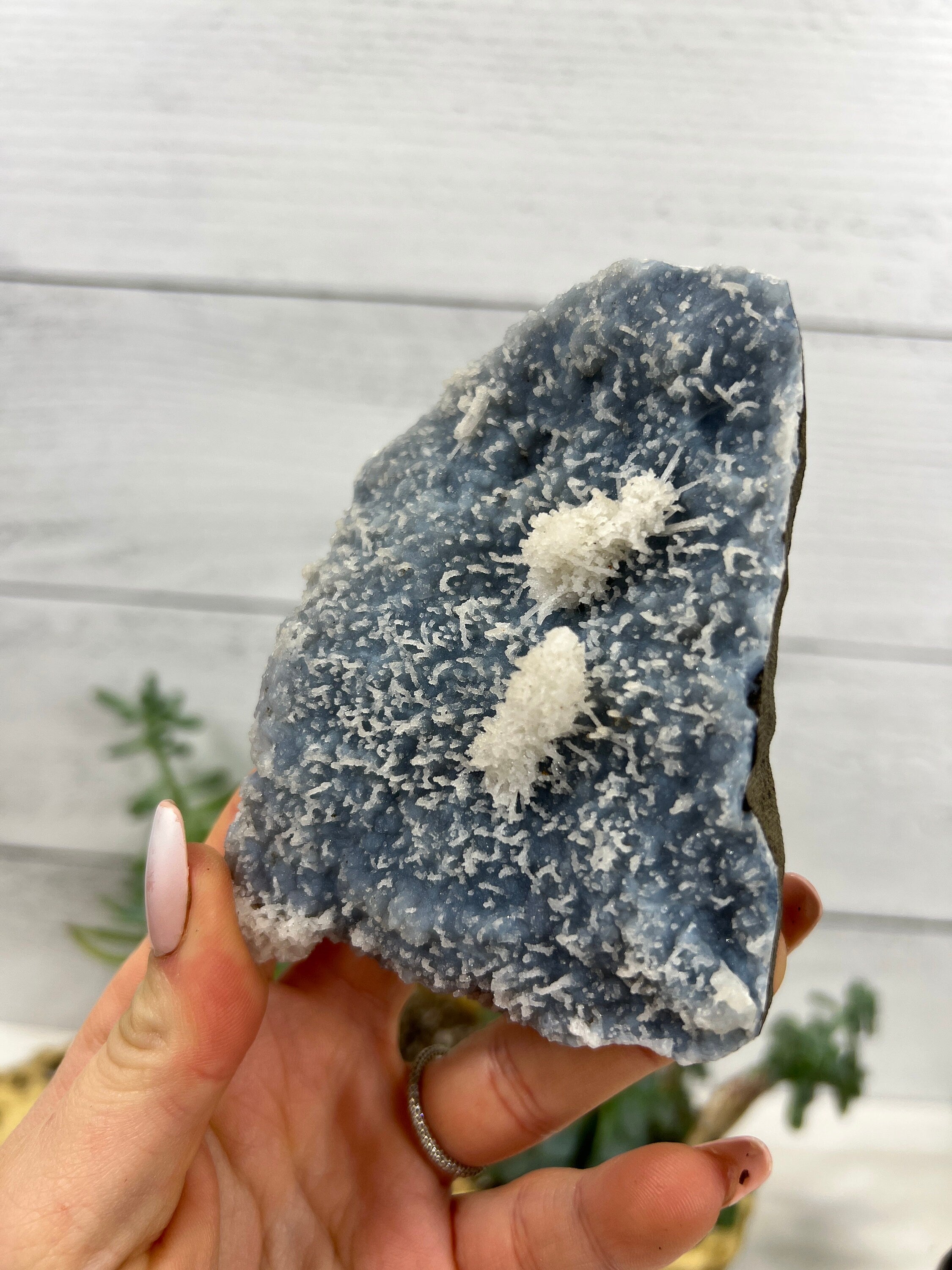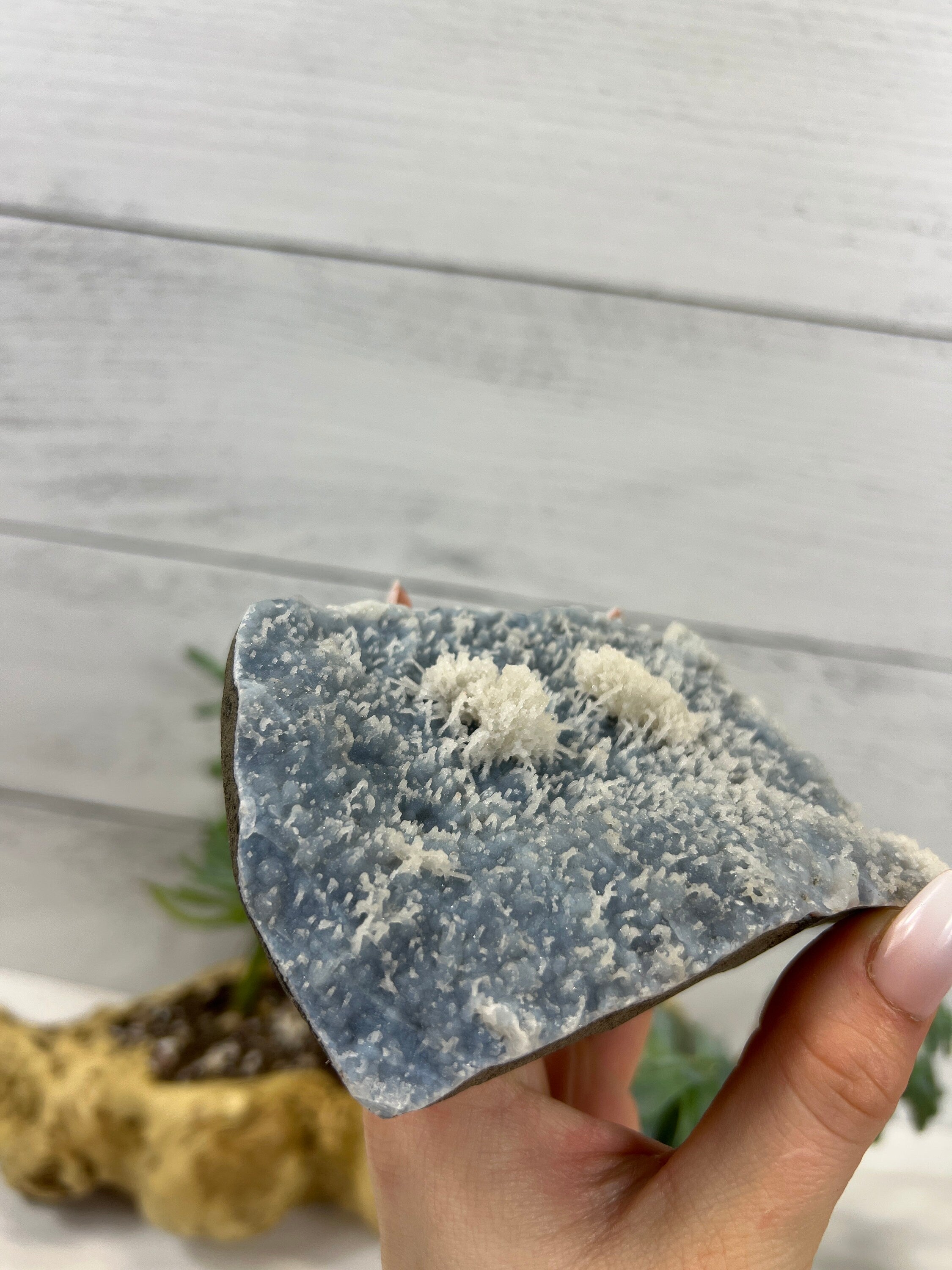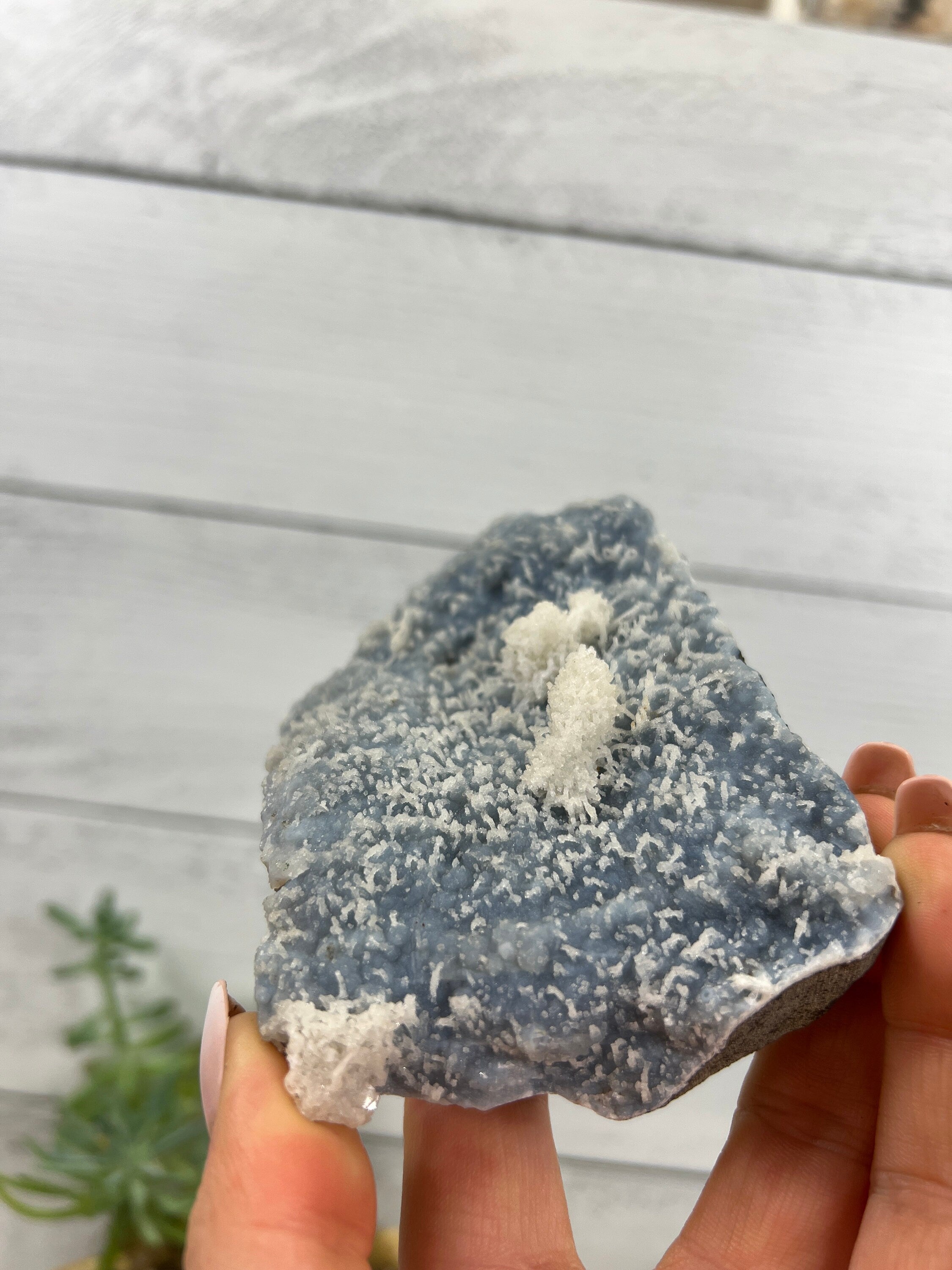 This is a rare, gorgeous, druzy bright blue chalcedony cluster with ‘spider-like’ quartz on its surface!