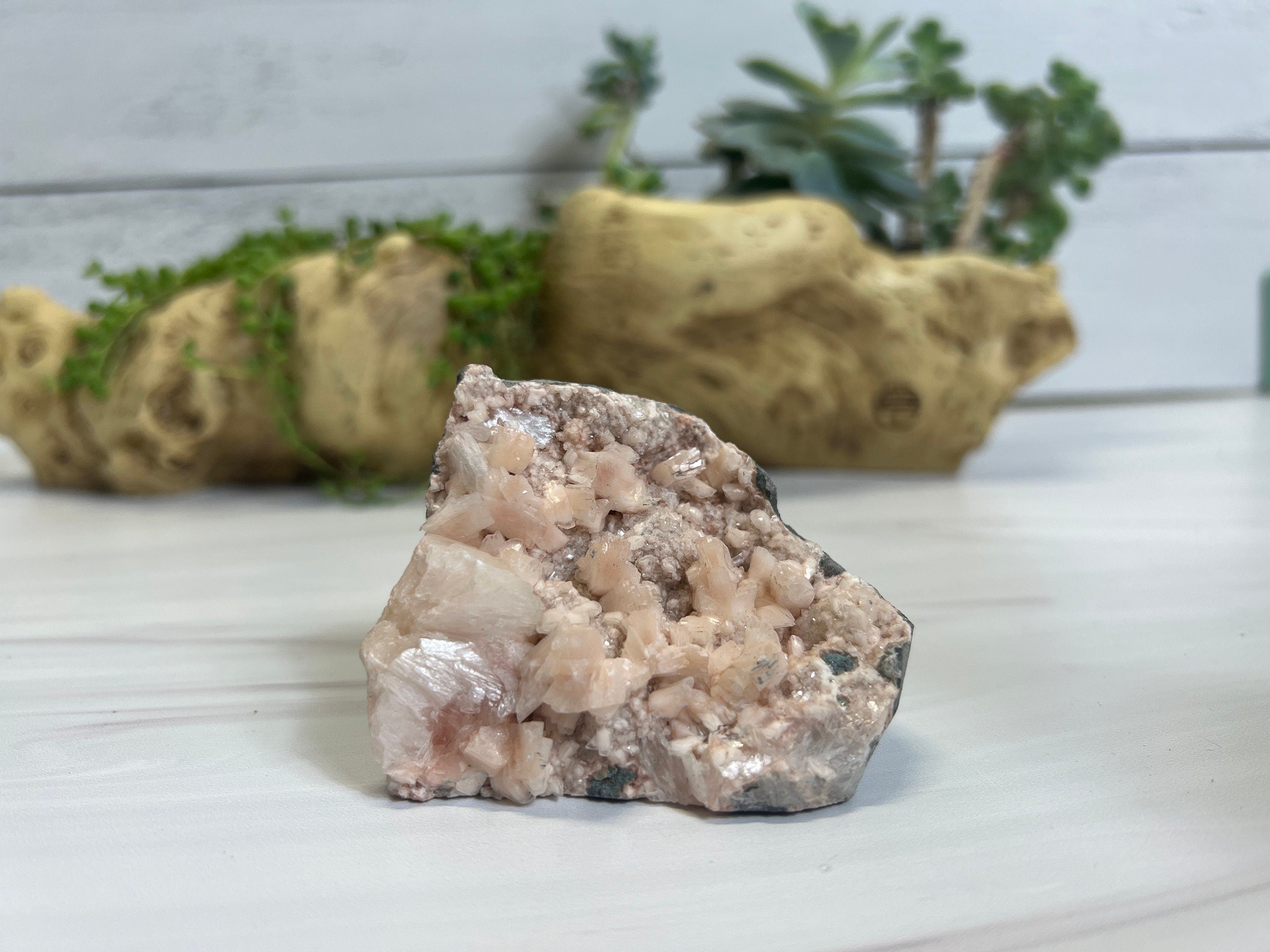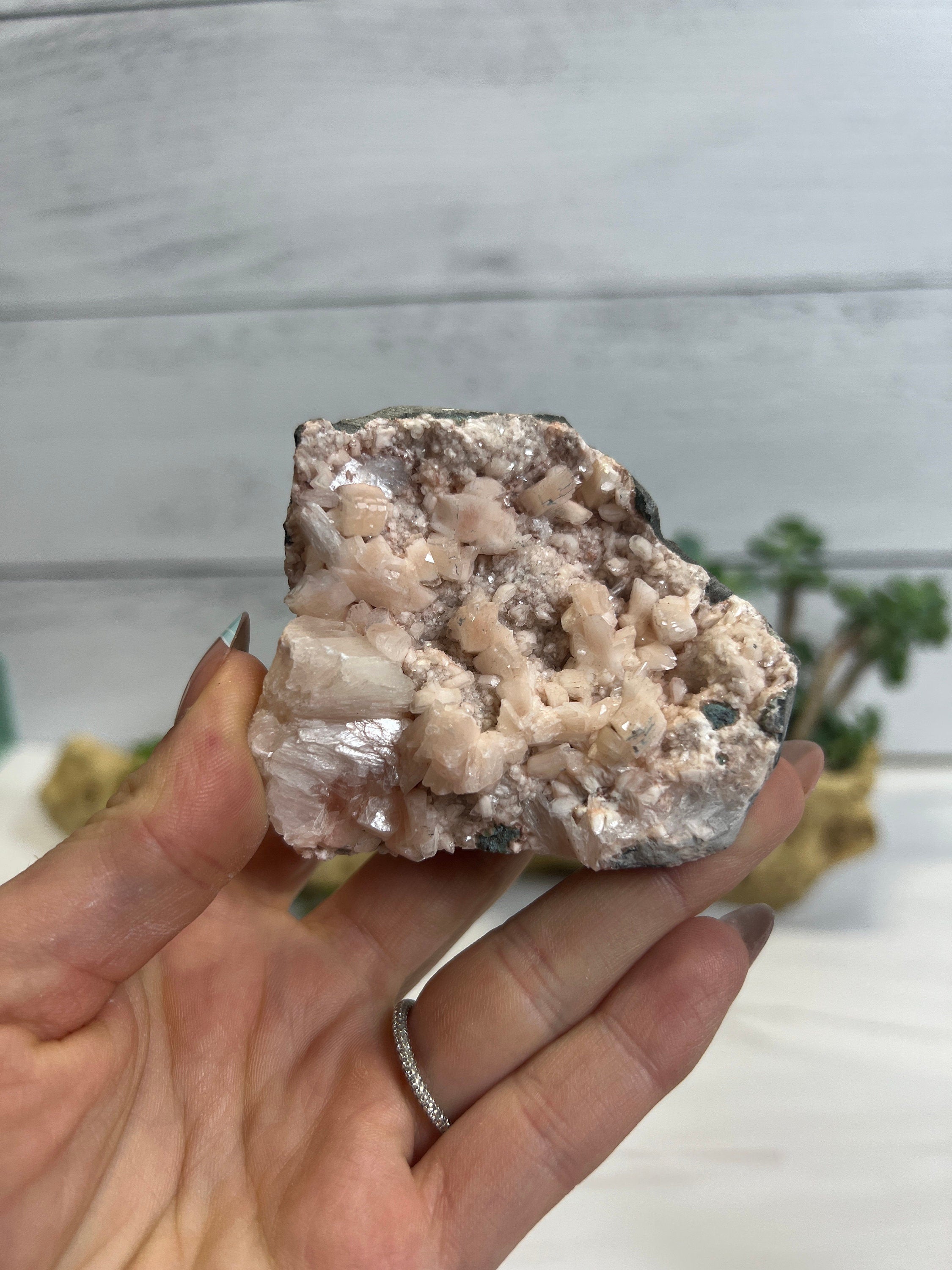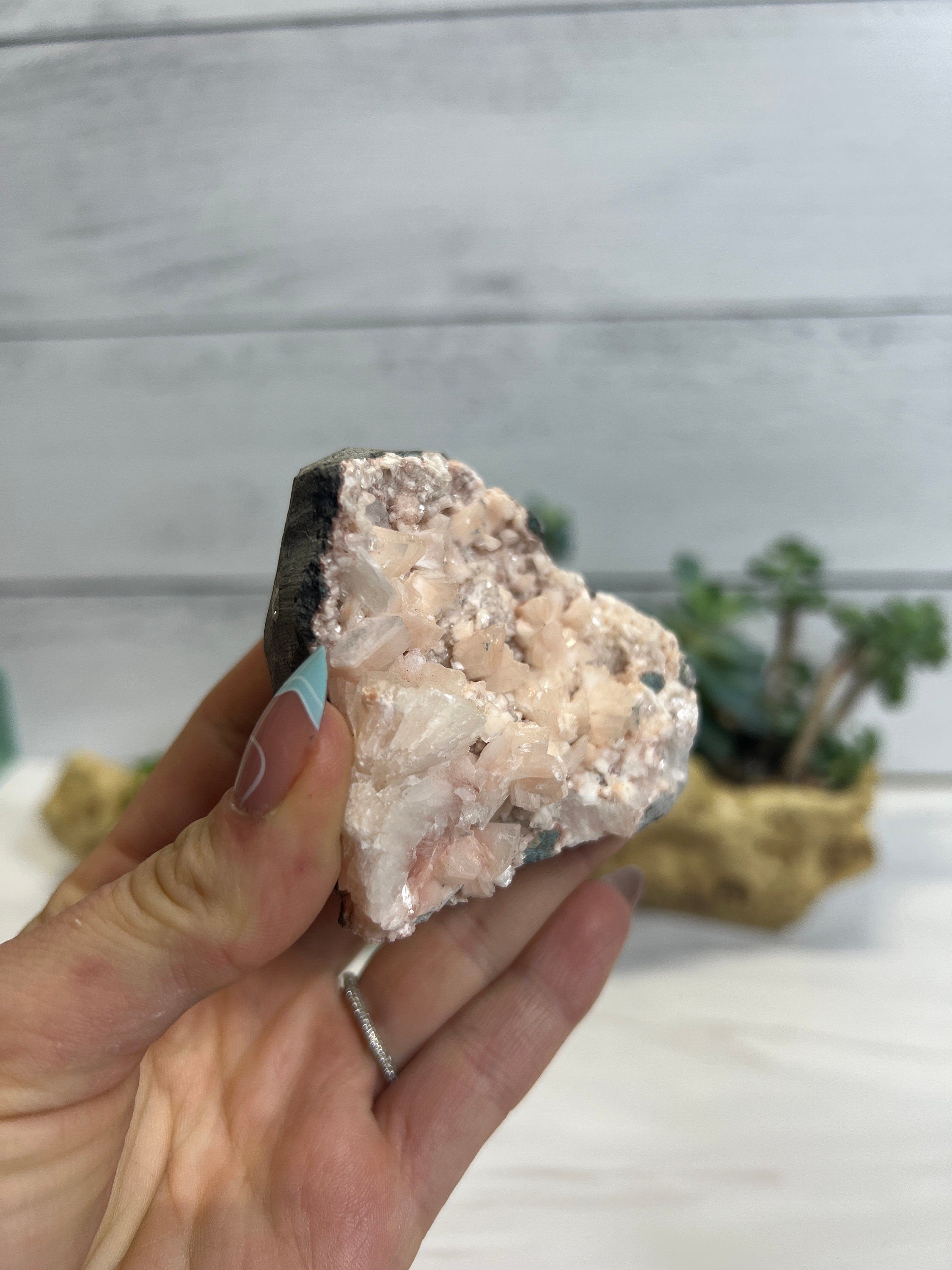 This gorgeous pink heulandite specimen weighs 146g (5oz), is 66mm in length and 40mm at its thickest point.