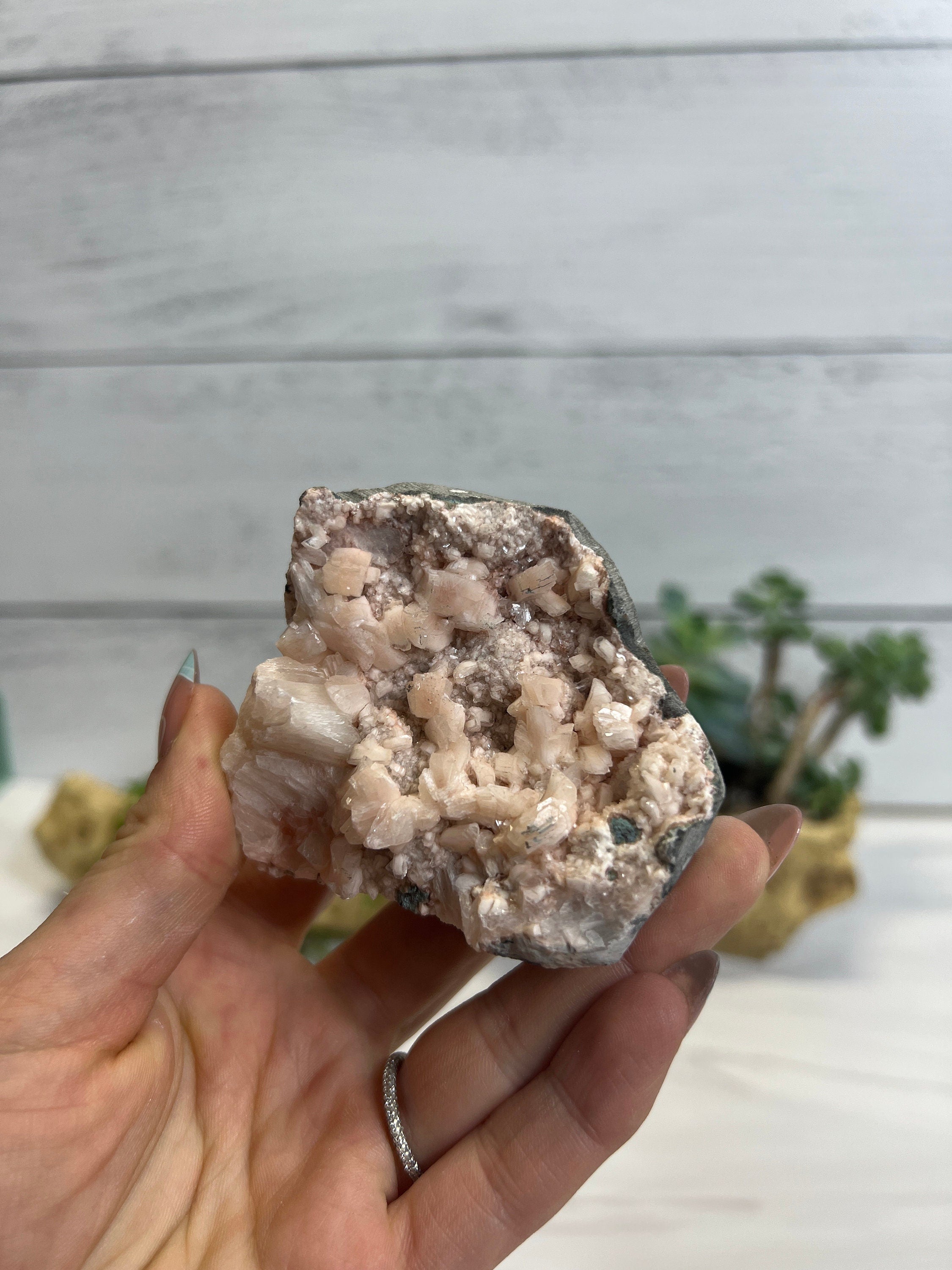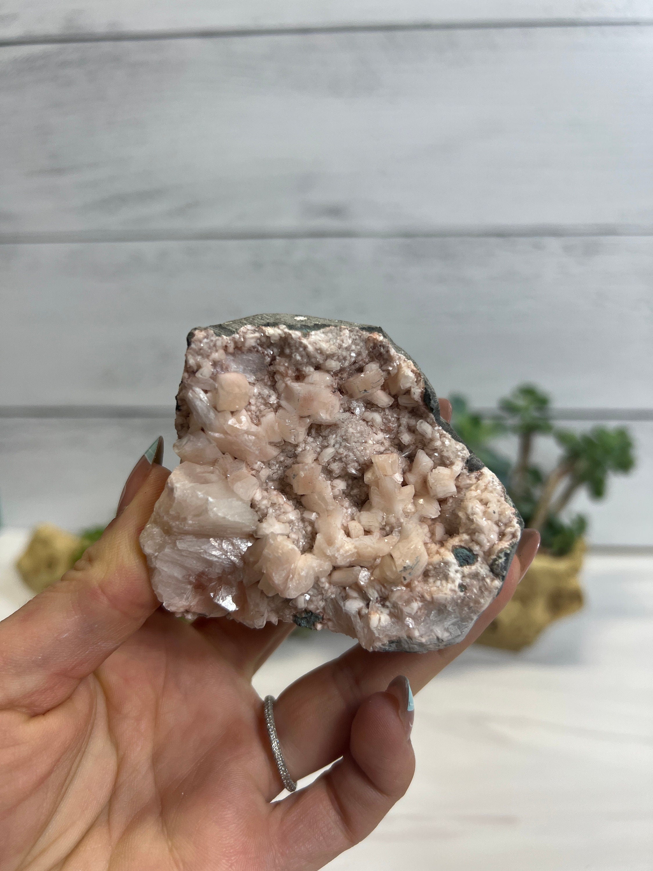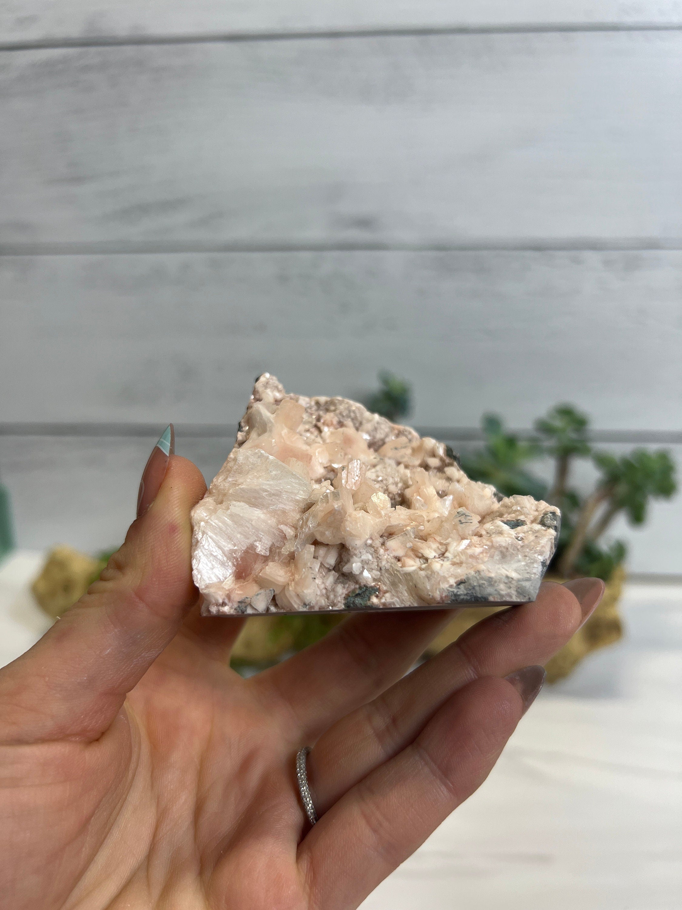 This gorgeous pink heulandite specimen weighs 146g (5oz), is 66mm in length and 40mm at its thickest point.